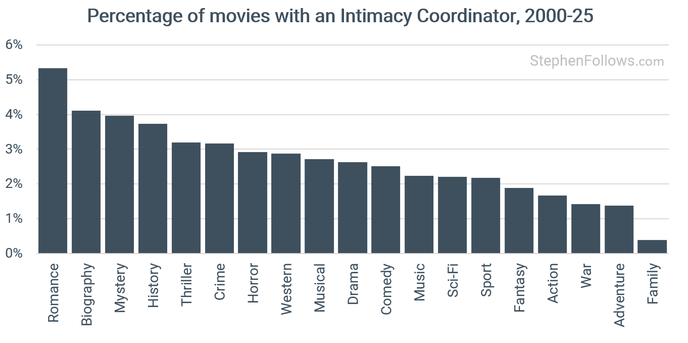 Perhaps unsurprisingly, over the past six years the most common genre to feature Intimacy Coordinators are romantic movies, where 5.3% of such productions included a credit. They were the least credited among War, Adventure and Family movies.