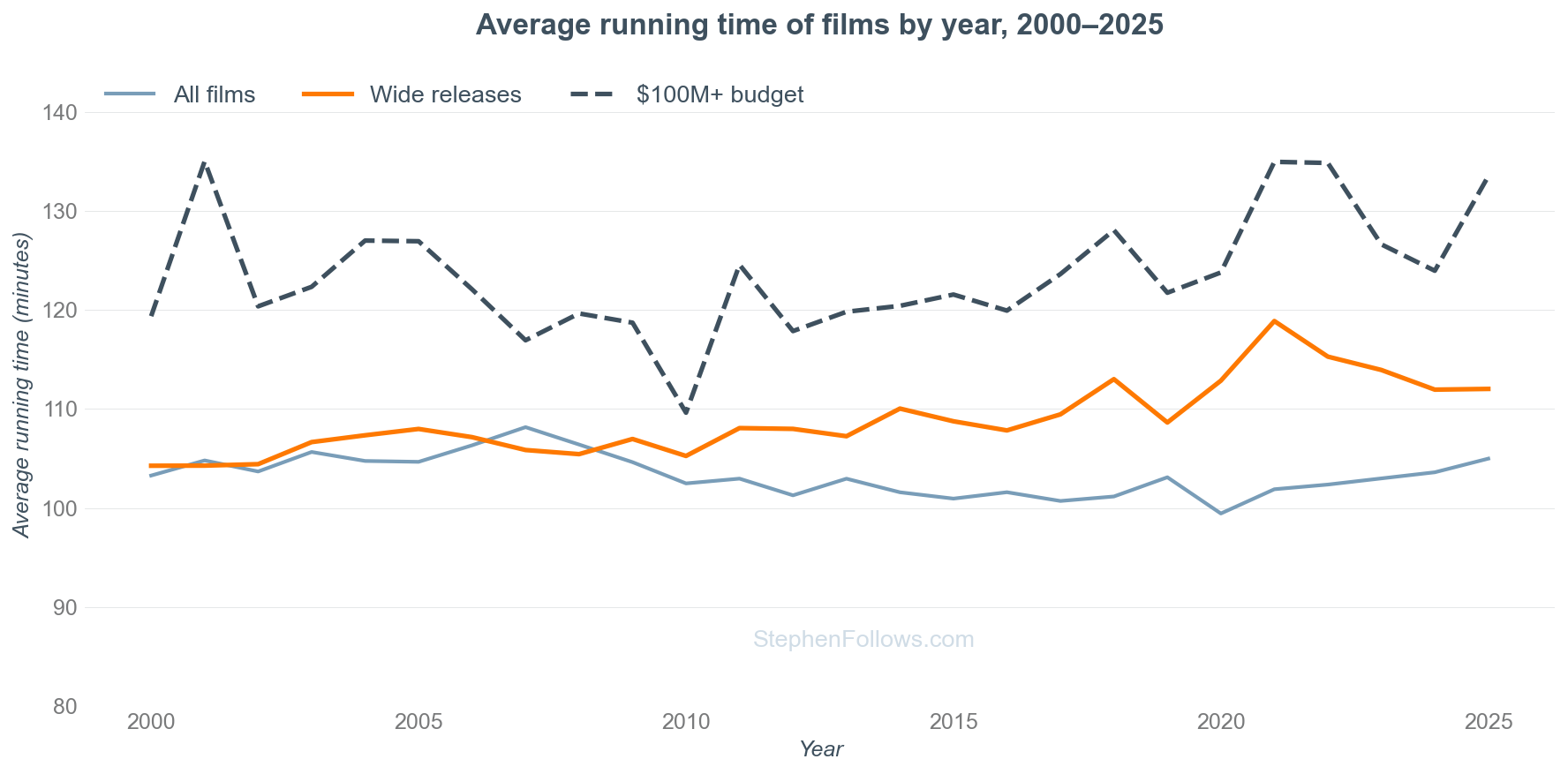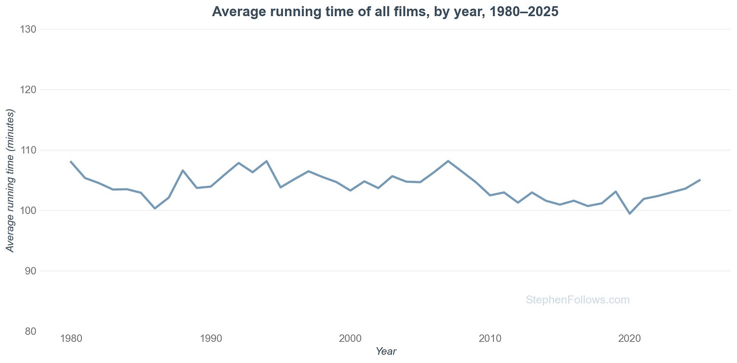 If you look at every film produced worldwide, the average running time has barely changed in decades. It has hovered around 100 to 103 minutes since the 1980s. In 2024, the average film was 103.6 minutes long.