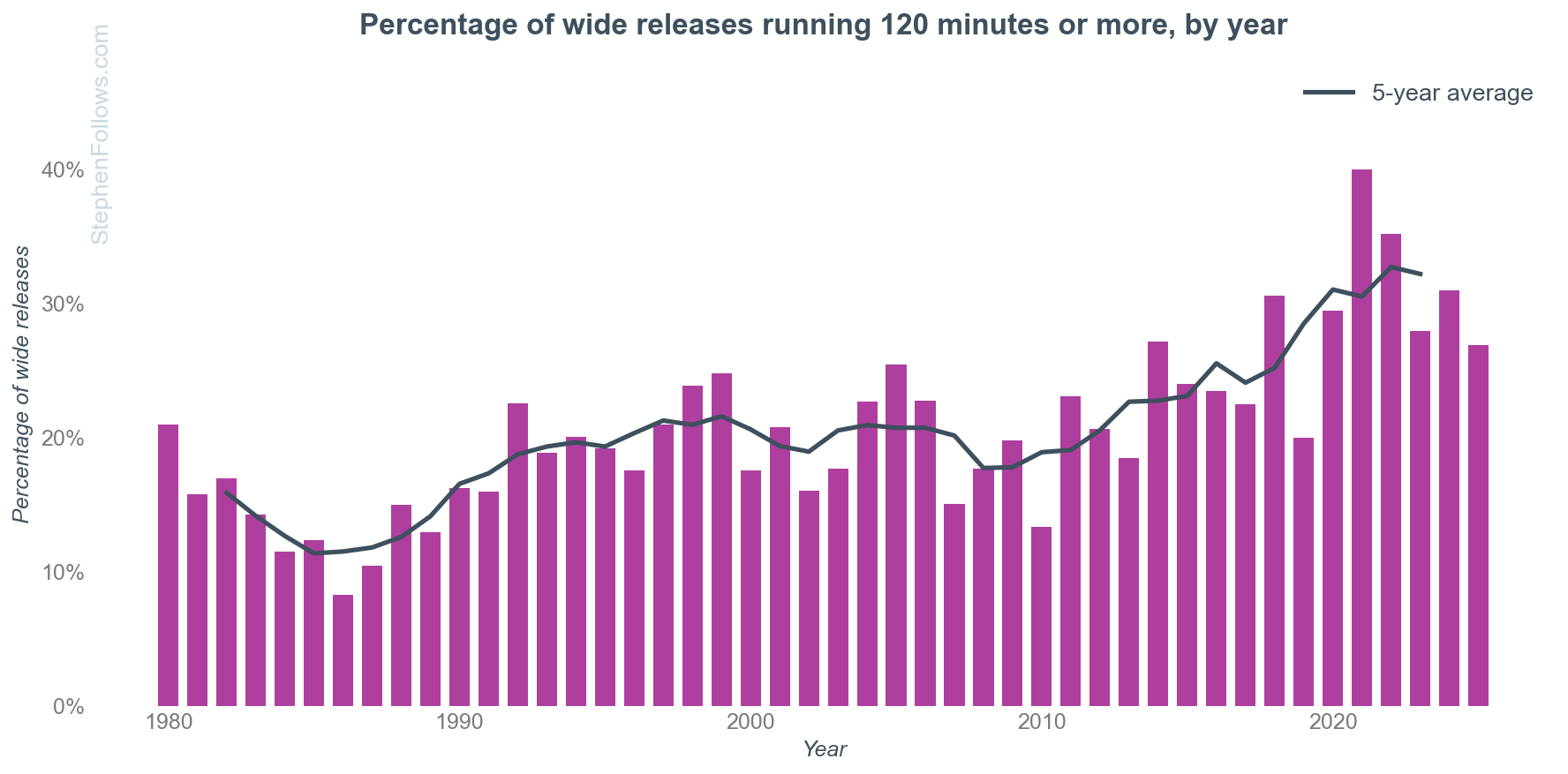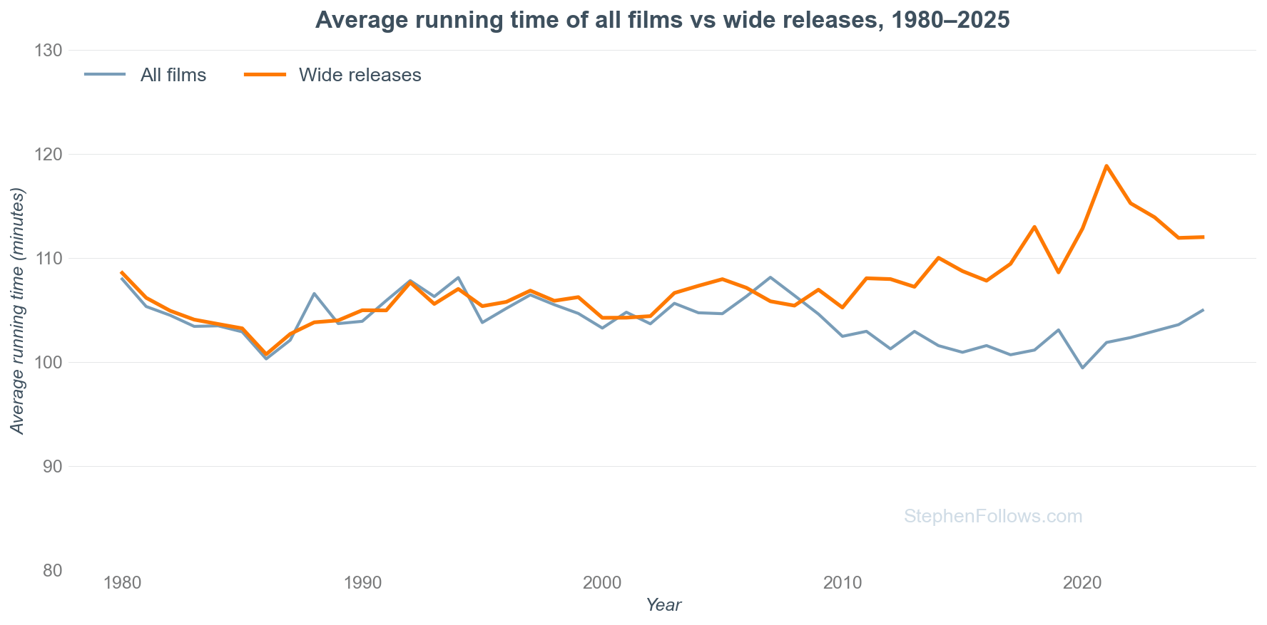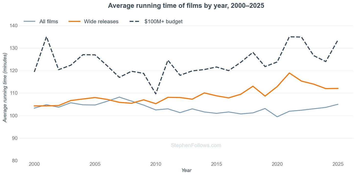 In the 1980s, around 14% of wide releases ran over two hours. In the 2020s, it’s 32%.