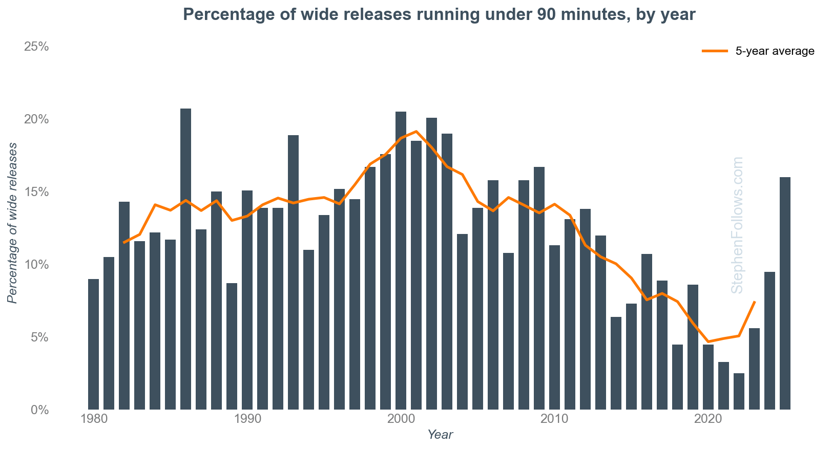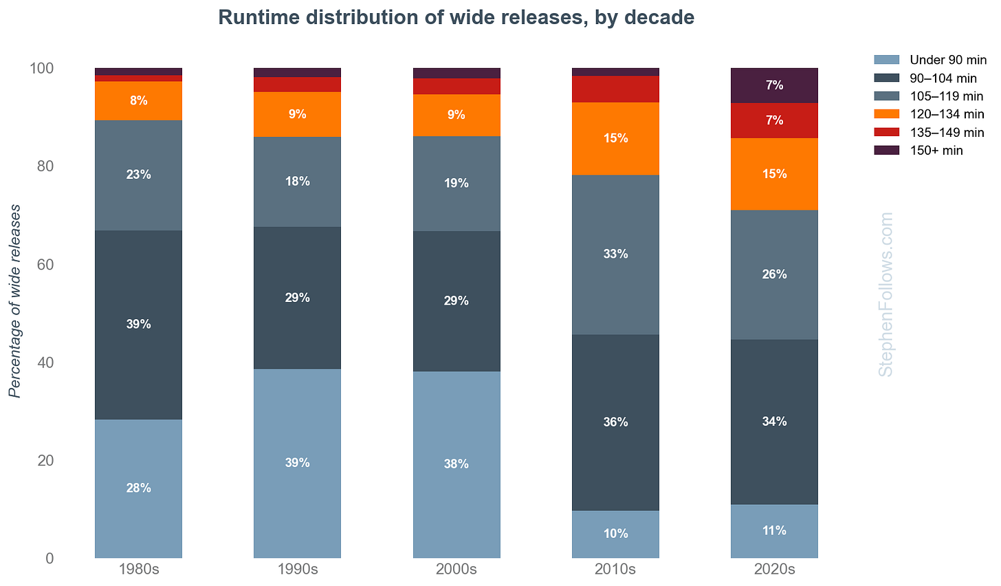 In the 1980s, roughly 13% of wide releases ran under 90 minutes. In the 2020s, that’s down to 7%.