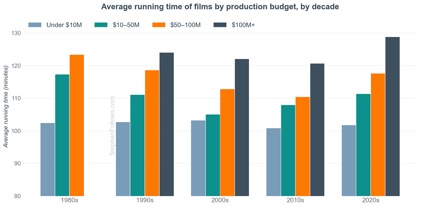 Films made for under $10 million have barely changed in length over four decades. But films budgeted at $100 million or more now average about 130 minutes, up from around 122 minutes in the 2000s.