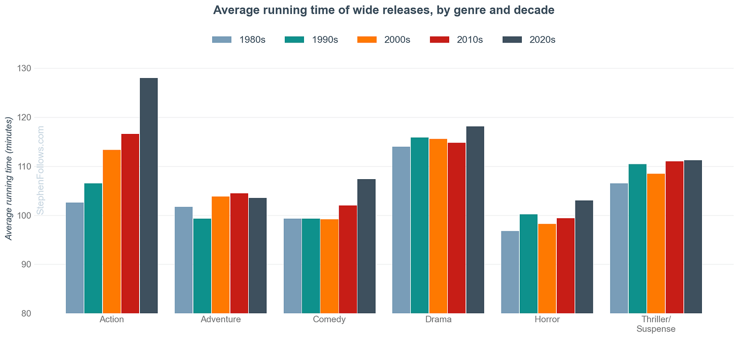 Comedy and horror have crept up too, but not to the same degree. Wide-release comedies held steady at 99 minutes from the 1980s through the 2000s, then nudged up to 107 minutes in the 2020s. Horror went from 97 minutes to 103. C