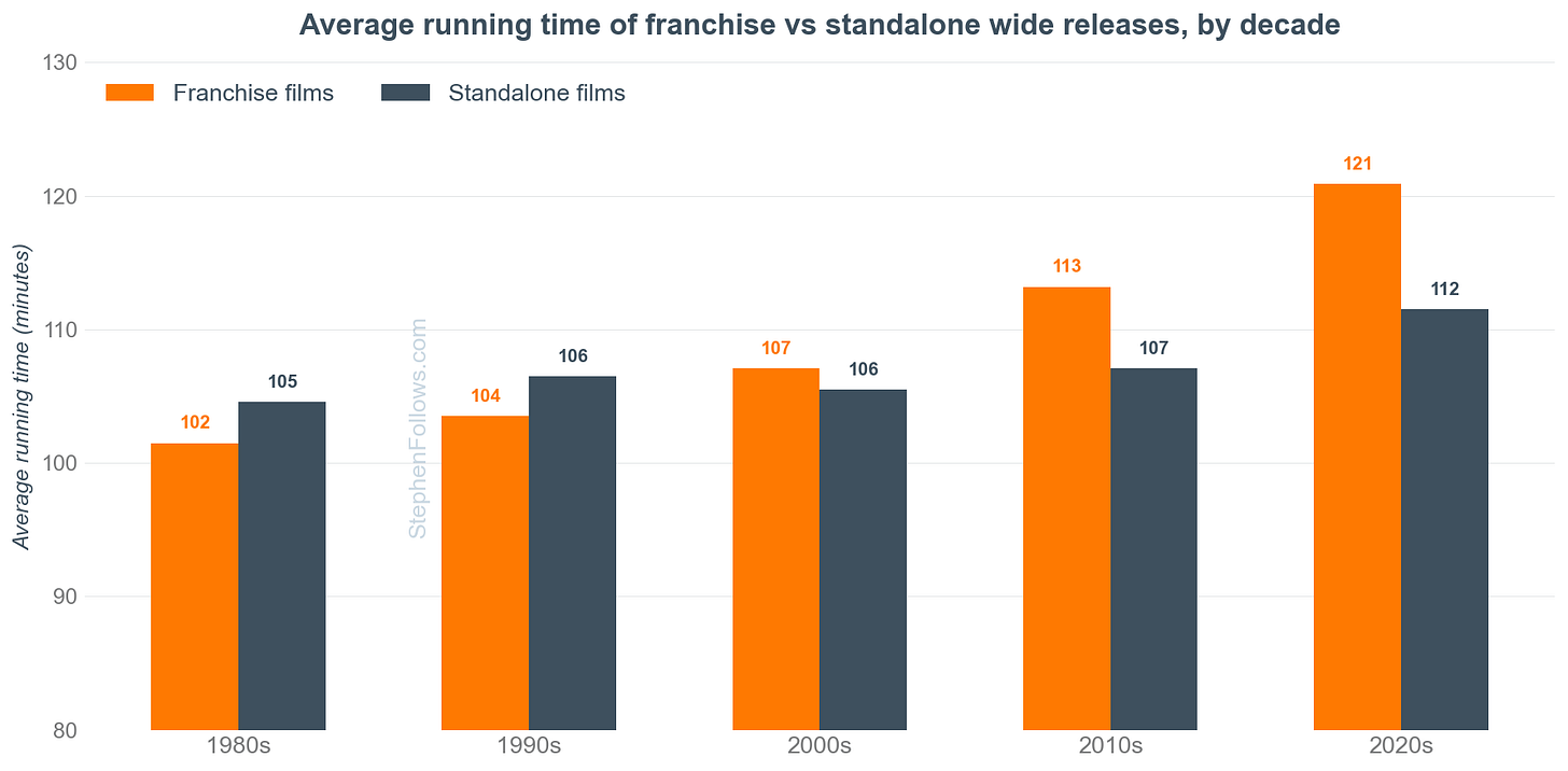 The crucial point is that both have got longer, with standalones going from 105 minutes to 112 minutes, and franchise films from 102 to 121.