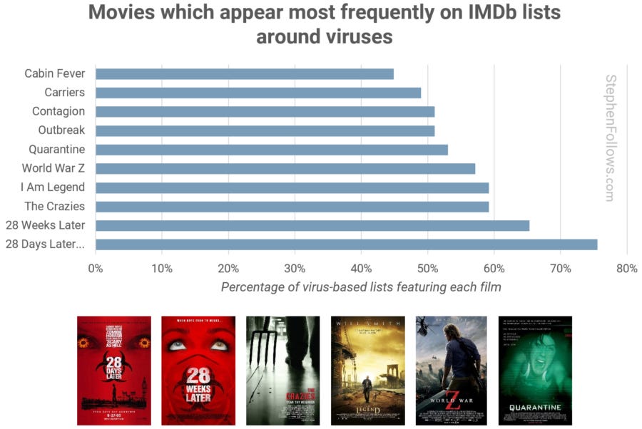 The definition of "virus-based" movies is always going to be a contentious one. I opted for movies in which the spread of a virus plays a key role and which are widely associated with a viral infection. I used plot summaries to judge the former and IMDb user lists for the latter. IMDb user lists are particularly interesting as they give us a way to track how much consensus there is about the contents of a movie among film fans.