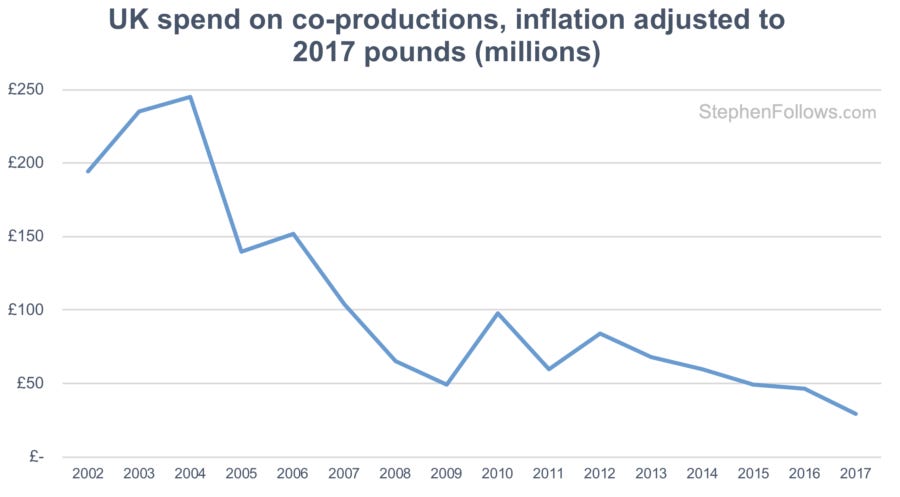 In the early 2000s, co-productions between Britain and other countries were extremely common, often accounting for more than half of all films shot in the UK. Changes in tax policy since then have meant that the advantages of a co-production now rarely outweigh the added complexity and costs involved. Last year, just 13 films chose to use a co-production structure, and their combined spend was just 1.5% of the total UK film production.