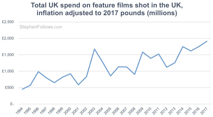 In just under twenty years, the amount spent on feature films in the UK has ballooned from £389 million in 1998 to £1.9 billion in 2017. Once we take inflation into account, this is an almost threefold increase.