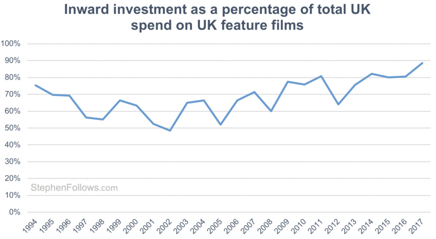 'Inward investment' refers to the money spent on feature films which are substantially financed and controlled from outside the UK. This type of investment has become an increasingly important part of the UK film production sector over the past few decades. Last year, it accounted for 89% of money spent on films shot in the UK.