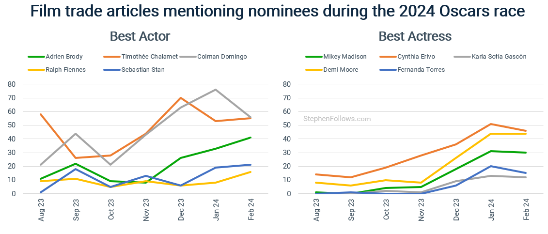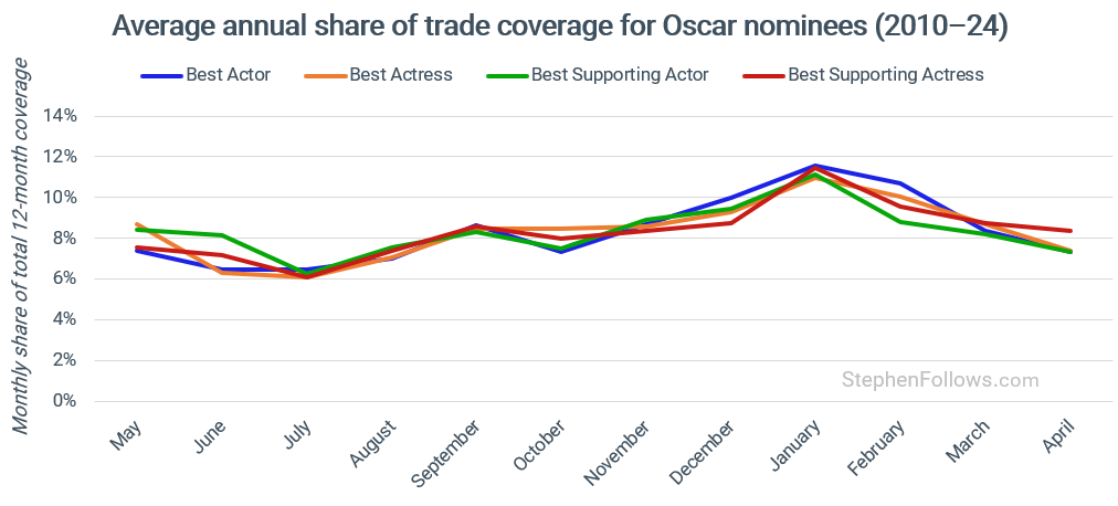 For example, in last year’s race, the best month for all five Best Actress nominees was January 2024. For the Best Actors hopefuls, three had their greatest amount of coverage in February, one in January and one in the preceding December.