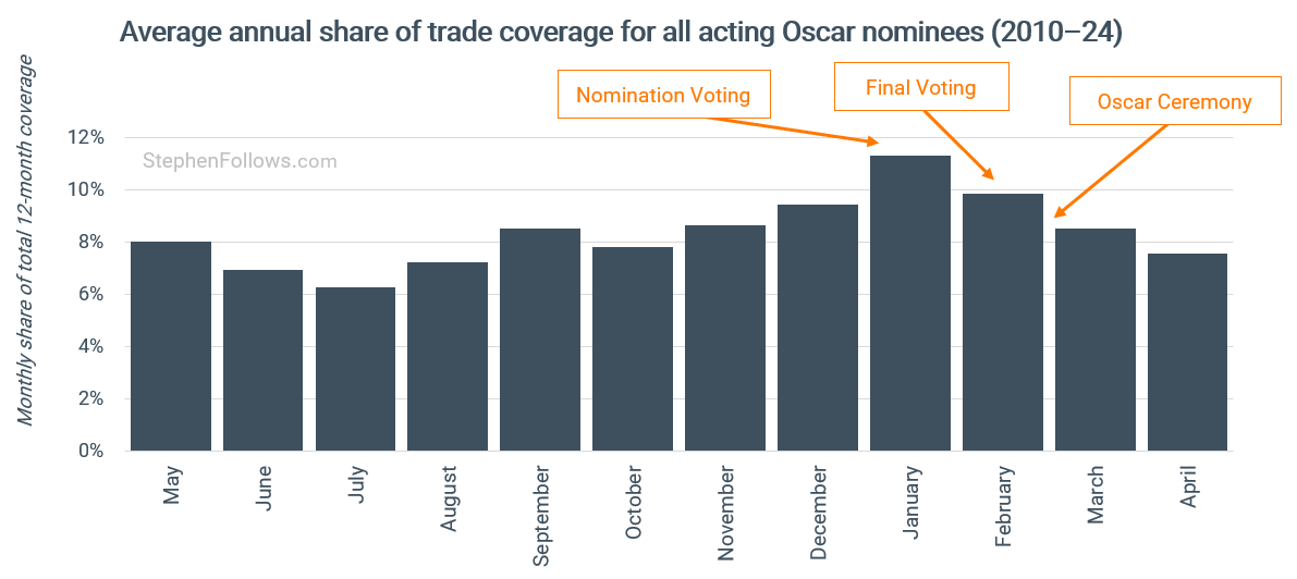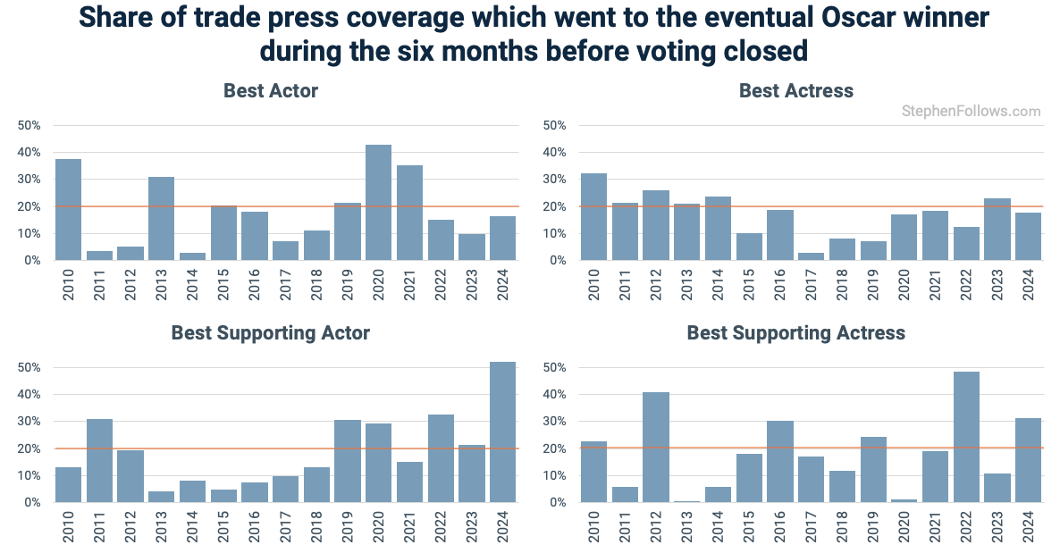For each year from 2010 to 2024, I took all the nominees in a category and measured how often they were mentioned in four major film trades during the six-month awards window. This runs from 1st September in the year before the Oscars to the end of February in the award year, covering festival premieres, campaigning, screenings, and voting.