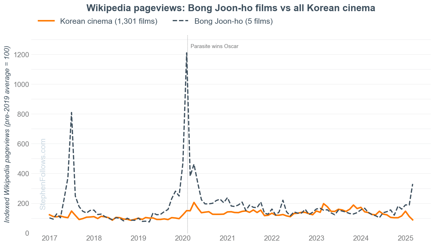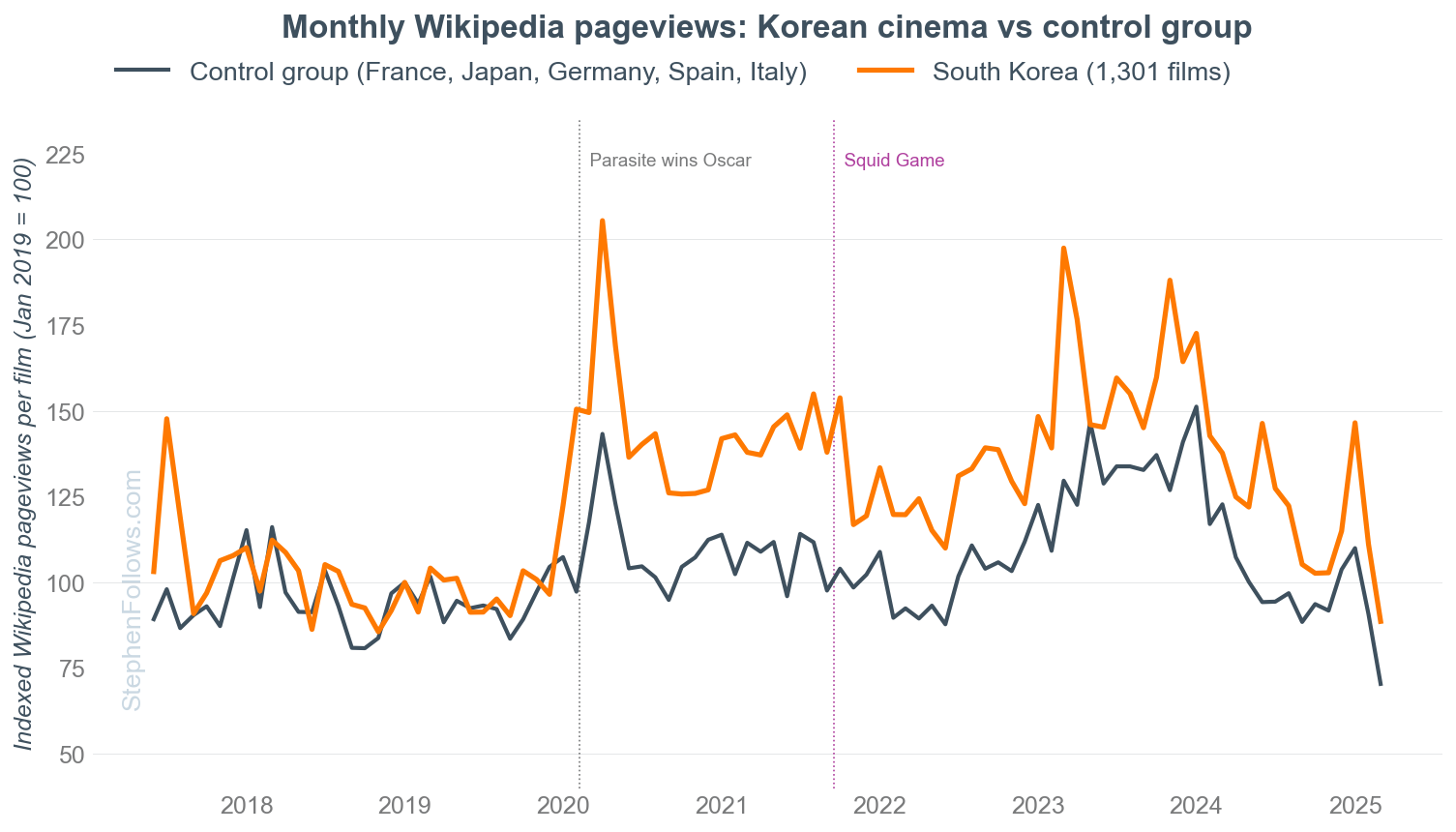 On the chart below, the orange line is per-film monthly Wikipedia views for 1,301 Korean films (Parasite excluded). The blue line is the comparison group, covering films from France, Japan, Germany, Spain and Italy (10,966 films in total). Both are indexed to 100 at January 2019, so what matters is the shape.