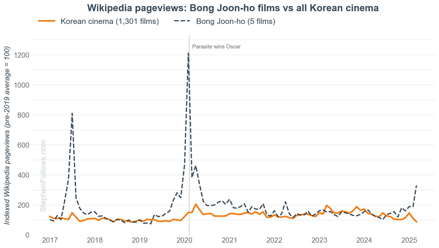 The data says national, not personal. Bong’s five pre-Parasite films moved +43% on Wikipedia in the 12 months after the Oscar. The broader South Korean catalogue moved +46%. On user reviews, Bong’s back catalogue barely shifted (+8%) while the wider South Korean catalogue almost doubled (+86%).