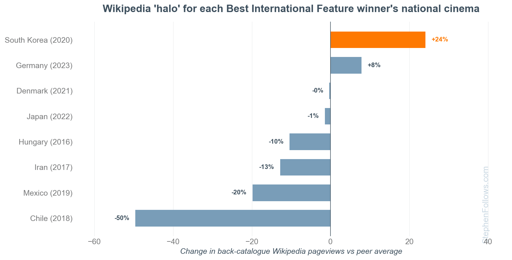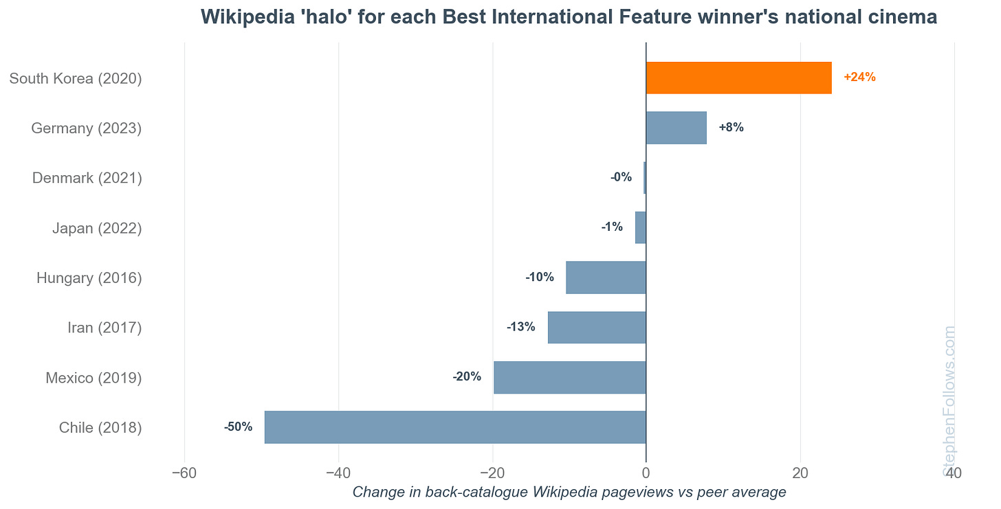 This reveals that South Korea is the only winning country that generated a meaningful lift for its national cinema. On Wikipedia, the South Korean back catalogue beat the global average by +24%.