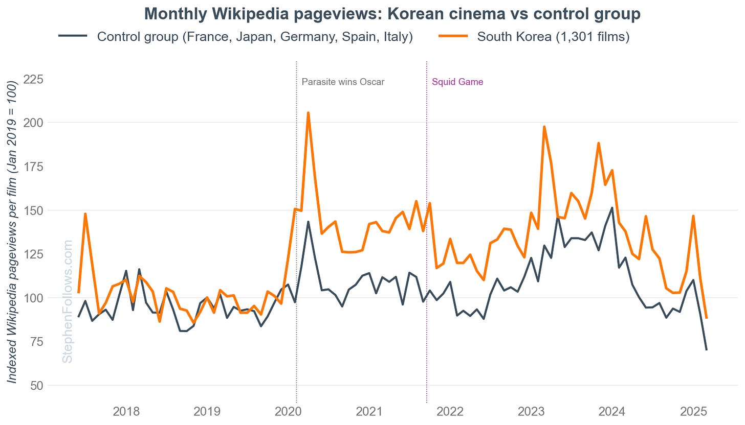 I have marked Squid Game’s September 2021 release to illustrate that the South Korean lift began a full 18 months earlier. So Squid Game wasn’t the trigger, even if it later reinforced the effect.