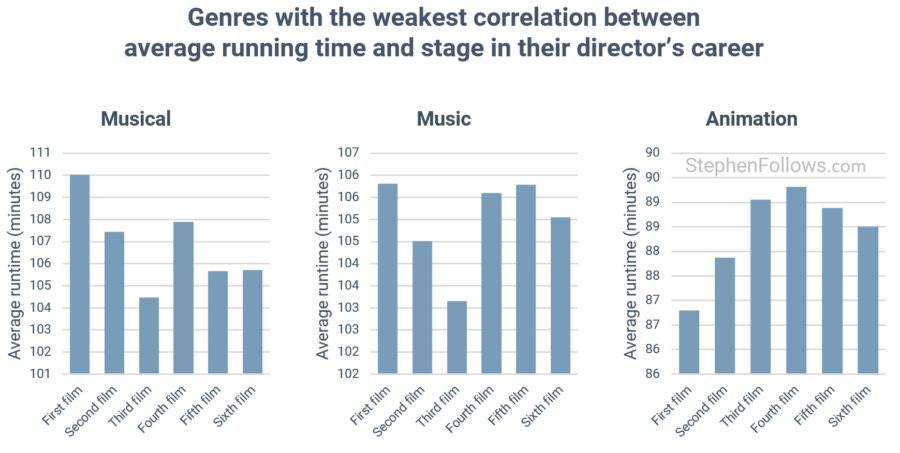 And here are the ones with the weakest connection. Interestingly, musicals are the only genre of movie where more experienced directors don't tend to make longer films. Musicals are also the genre that typically has the longest durations across the board, so maybe they've already maxed out on their first movie.