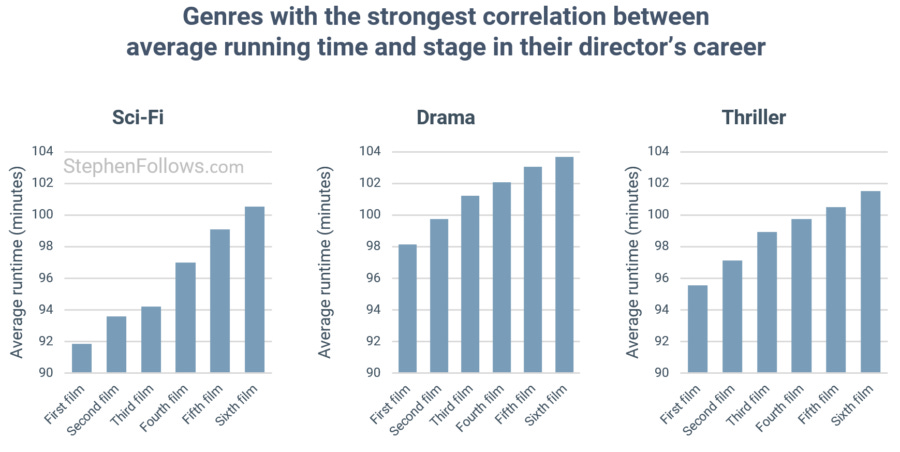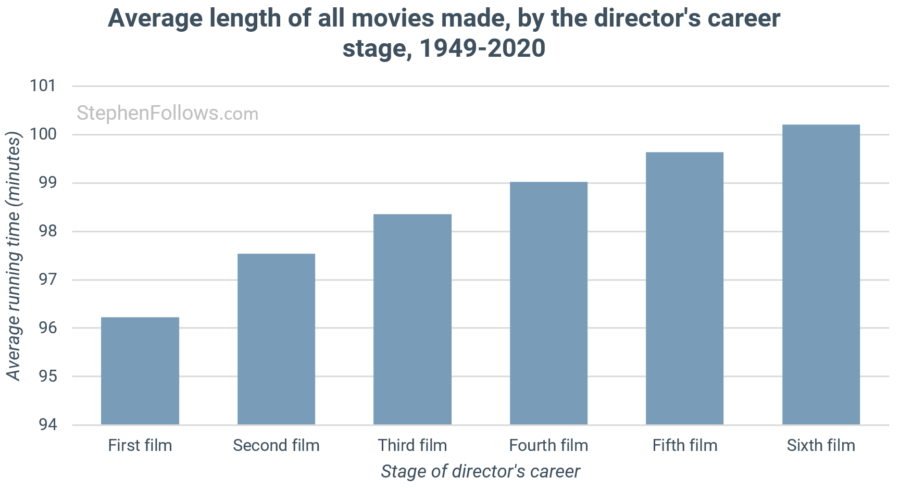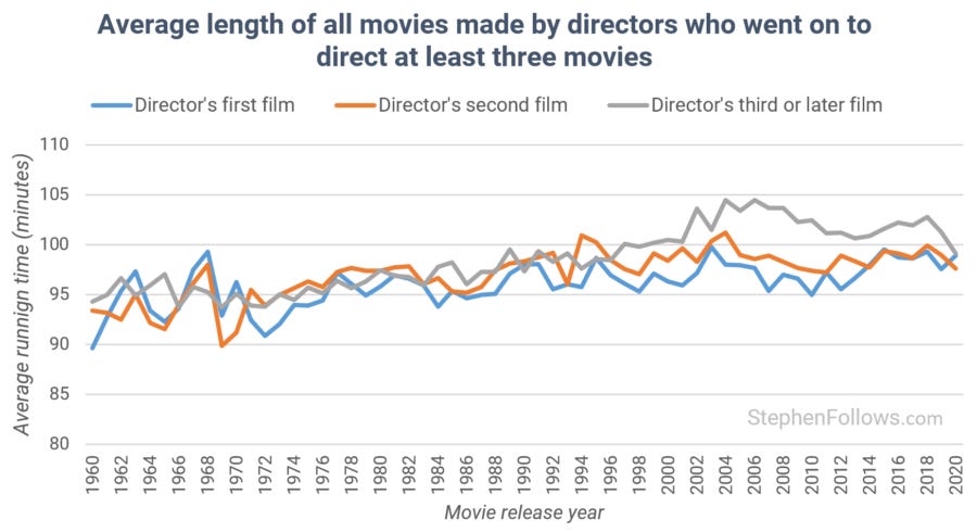 The filmmakers I was speaking with cited countless examples of longer movies and I instinctively said that they may get to make longer movies as their careers progress. They requested evidence and I couldn't back up my hunch. From past research, I knew that the average movie in cinemas comes in at 96.5 minutes and that just 5.8% of movies are over 140 minutes long. I knew that many of the longest films come from established directors such as James Cameron, Peter Jackson, Spike Lee, Oliver Stone and Steven Spielberg but the plural of 'anecdote' is not 'data'! I did not have hard numbers.