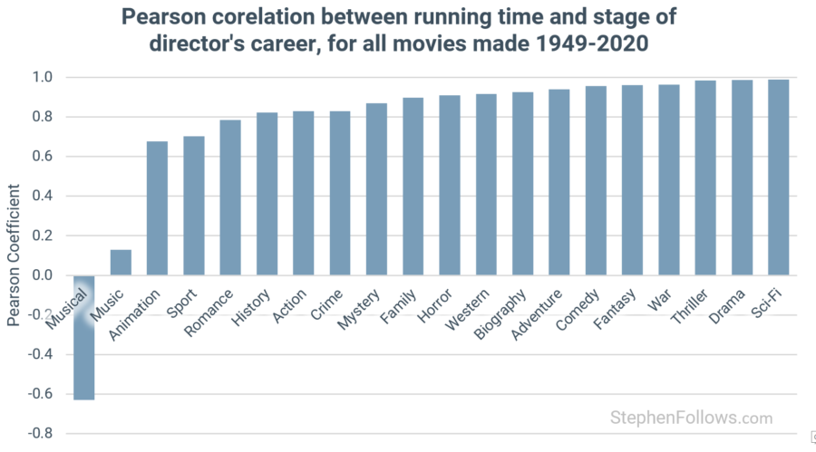 Using the Pearson coefficient we can measure the level of correlation between the running time and the experience of its director for each genre. A score of positive one would indicate they are completely positively correlated, zero means no connection and minus one means they are negatively correlated.