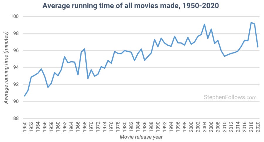 As we dig deeper it's worth noting that movies are broadly getting longer. In 1950 the average movie was 90.7 minutes long, whereas by 2018 it was 10% longer, at 99.3 minutes.