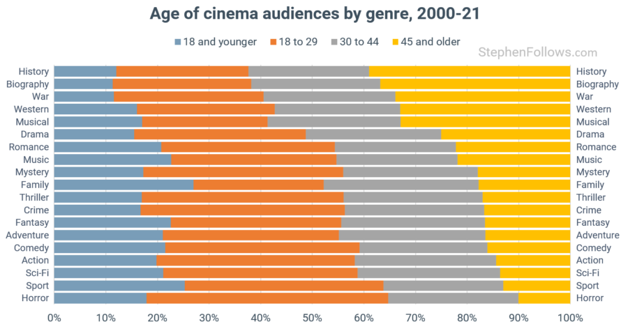 As the chart below shows, older audiences are most interested in watching Historical films (where 39% of the cinema audience have been 45 or older), Biographies (36.8%) and War (33.9%) films. There is a lot of overlap between films in these genres (i.e. most war films are historical and many are also biographies).