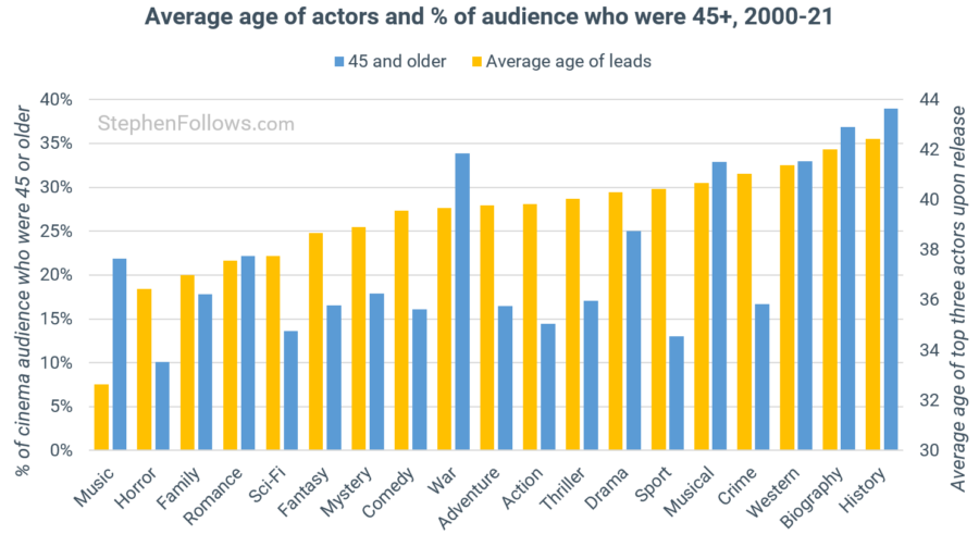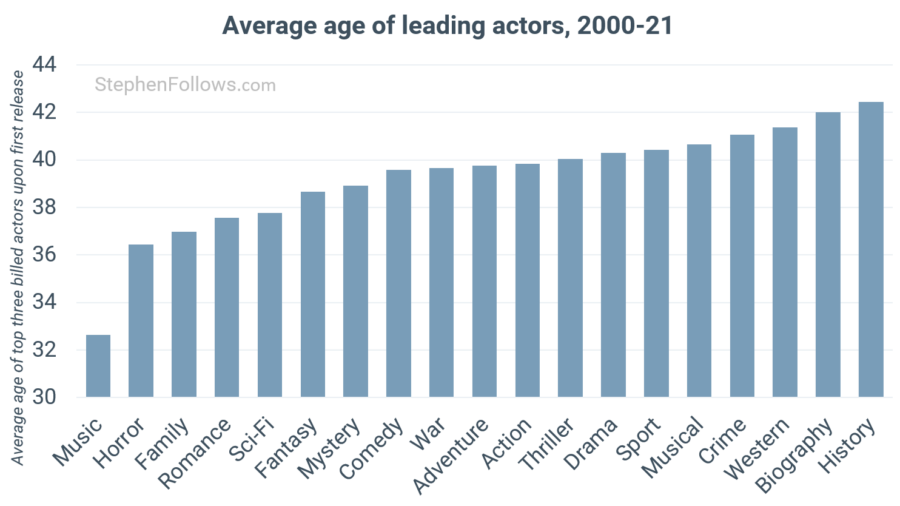 The only genre where this difference seemed to actually matter was musicals, where the average was 40.7 and 37.1 respectively. I suspect this is just the effect of a small number of musicals but could also be read as smaller / indie musicals casting older actors.