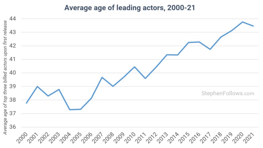 In 2000, the average age of the three top-billed actors in movies in cinemas was 37.8. Twenty years later, in 2019, it had grown to 42.4, getting older by almost three months every year (i.e. Paul Rudd levels of ageing).