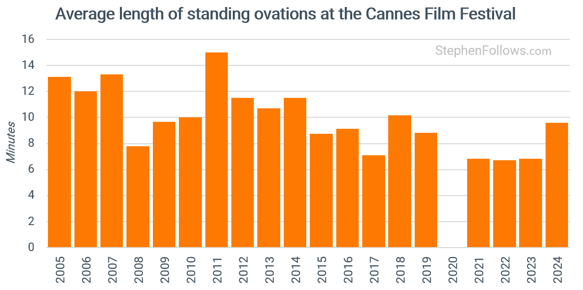 Looking more closely at Cannes, the festival most associated with marathon applause, the average length of a standing ovation in recent years has been around nine minutes. That’s down from peaks in the mid-2000s when films like The Artist (2011) and Mud (2012) drew ovations of around 20 minutes.
