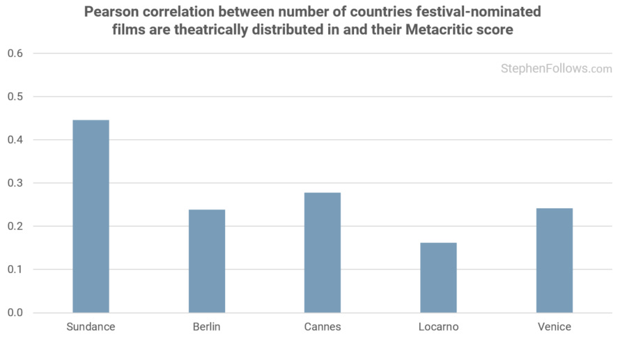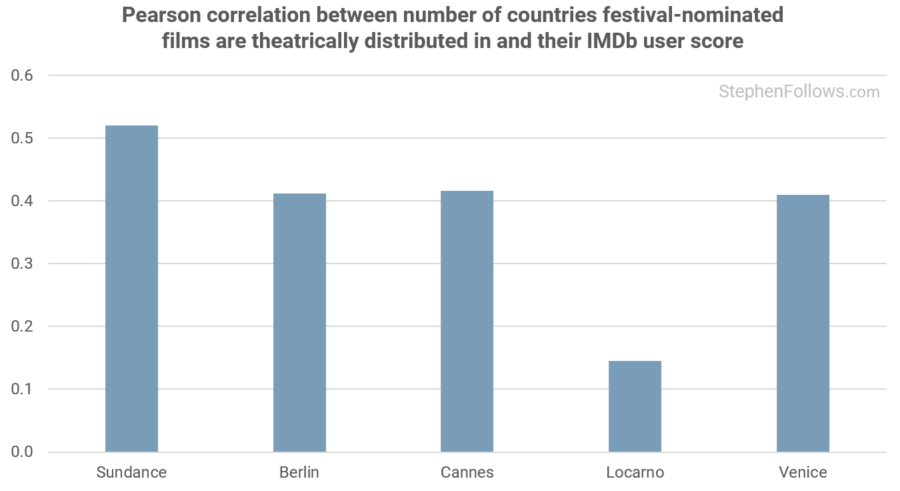 Sundance films have the highest Pearson scores, meaning that the best films at Sundance have a higher chance of wide distribution compared with the other four festivals in my study. Locarno is at the bottom, with a score of under 0.2, which is not generally regarded as statistically significant.