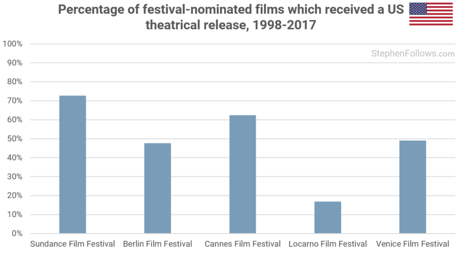 We'll start by looking at US distribution. Over half of Sundance and Cannes-nominated films reach US cinemas, with Venice and Berlin nominees not far behind. Locarno films are less successful, with fewer than one in five making it to the big screen in America.