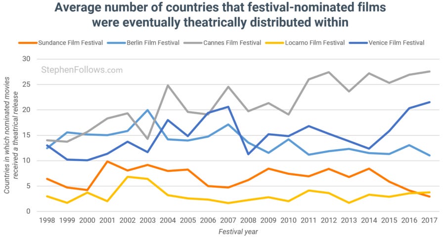 Firstly, distribution has been getting wider over time. In 1998, the average Cannes-nominated film reached cinemas in 14 countries. By 2017, this had doubled to an average of 28 countries.
