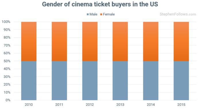 Interestingly, this doesn't come down to more women going to the cinema. (Well, female cinema-goers are slowly increasing but at the same rate as male cinema-goers). In the US, the audience of frequent cinema-goers has been 50:50 for all of the recent past.