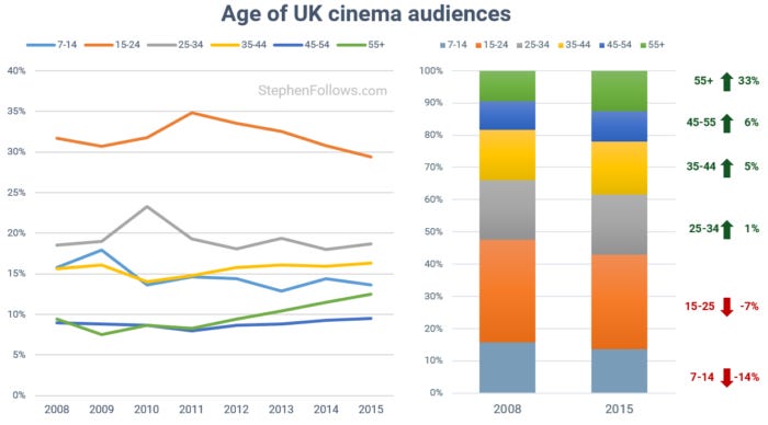 There has also been an increase in the number of movies aimed at older audiences. The film business has historically been very bad at recognising, tracking and supplying films to older cinema-goers. Most surveys of cinemagoers lumped everyone older than 45 years old into a "45+" category and it has only been in the past few years that we've seen the emergence of a "45 to 55" and "55+" categories. (Even then, average UK life expectancy is 82 years old, meaning that the "55+" category covers 42% of the average adult life).