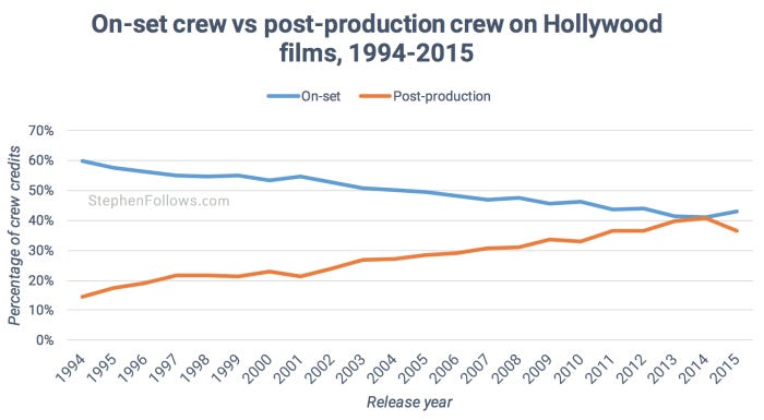 In 1994, only 15% of the people who worked on the average Hollywood movie worked in some form of post-production role (i.e. editing, visual effects, sound, music, etc). Twenty years later, this has ballooned to 41%, thanks mostly to the increased quantity and complexity of visual effects.