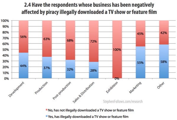 Only 2% of people working on films over $10 million admitted they illegally pirate movies, compared with 70% of those working on films under $1 million.