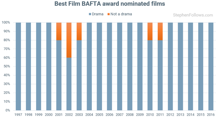 Between 1997 and 2016, 94% of the films nominated for Best Film at the BAFTAs were dramas. Over this twenty-year period, the only non-dramas to be nominated were Inception, Avatar, Chicago, Shrek and Amélie (none of which ended up winning the category).