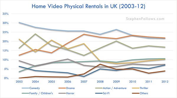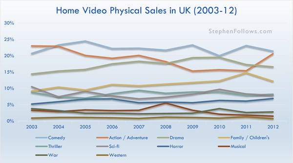 Every year since 2004, Comedy has been the biggest draw for Home Video physical sales (VHS, DVD and Blu-rays).