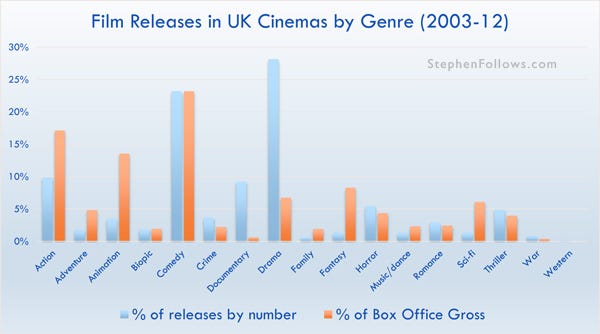 Recently, both Catherine Rampell from the New York Times and Ted Hope have published interesting data on genres. Catherine Rampell looked at how audiences and critics typically rate genres differently - the genre they disagree most about is romantic comedies. On Ted Hope's Filmonomics blog, Colin Brown showed how investors are four times keener to invest in comedies than LGBT and faith-based films. To join in the debate, I've had a look at genre from the point of view of the UK film industry. In summary;