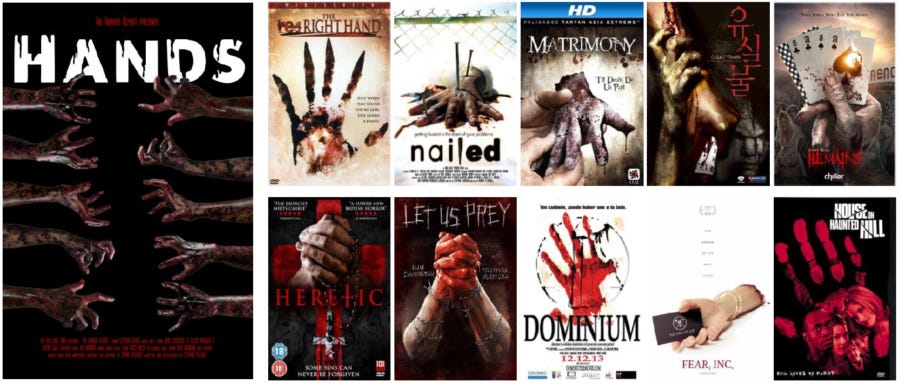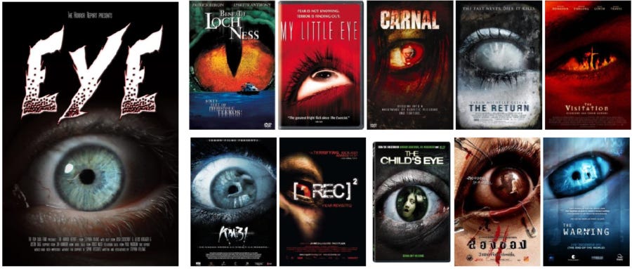 Recurring themes in horror movie posters include eyes, skulls and hands.