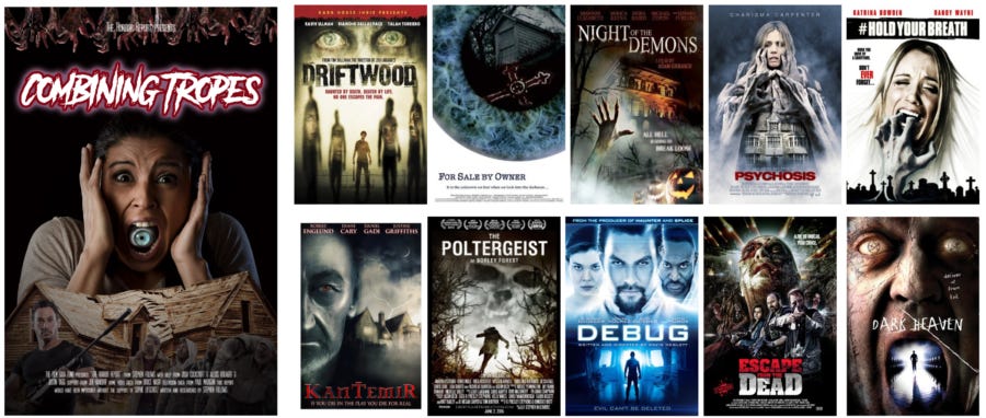 5% of horror movie posters combine multiple tropes. It’s debatable whether such combinations have a positive impact on the viewer (by giving them more clues and information about the movie) or a negative impact (confusing the clearly established tropes and their connotations).