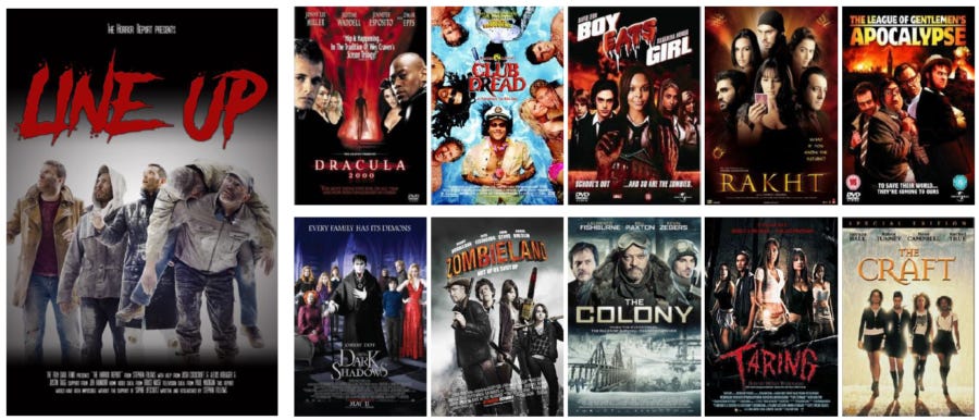 The ‘Line up’ film poster is commonly used across genres to sell a film based primarily on the box office power of its cast. It can also be used to imply that much of the movie will rely on the interactions between the characters, rather than actions with an unseen or ‘other’ being. As a result, this trope is used three times as often for horror comedies as for horror thrillers.