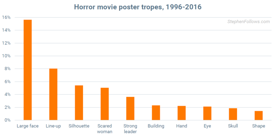 The most commonly used trope is a single large face, with 53% of films using some variant of this. Of these, over 68% of posters had the featured character looking directly at the viewer.