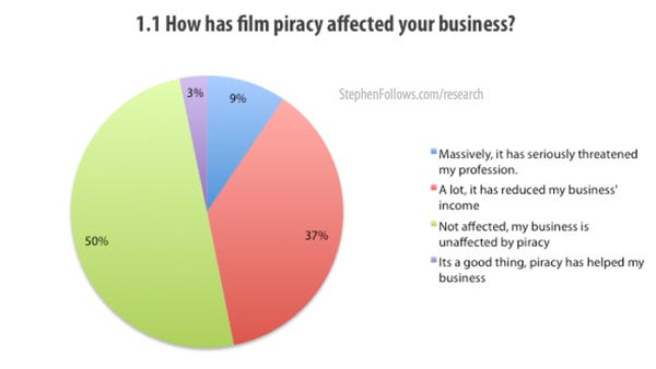 Half of all my respondents felt that piracy had no effect on their business. 37% felt it had reduced their business' income, 9% said it had "seriously threatened" their profession and 3% felt it had helped their business.