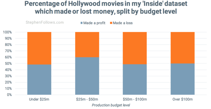 Using my 'Insider' dataset of 279 Hollywood movies I found that overall 51% made a profit and 49% made a loss. This pattern of 50:50 seems to be the common understanding of movie economics among the insiders I spoke to. When the final profit or loss is expressed as a percentage of the original production budget we can see how the majority of films make or lose a figure close to their original budget.