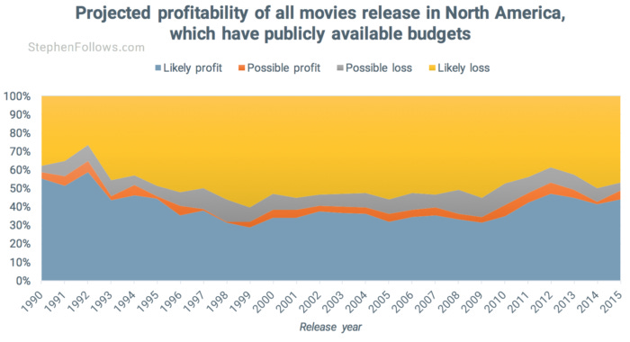 I have tried to find a more reliable multiple than just "budget times two" but unfortunately the intricacies of movie economics make this too hard to do with just the two figures to work from (i.e. budget and box office gross). Therefore, I tweaked the formula slightly to add an element of confidence to the result, rather than a binary "Profit" or "Loss" outcome, and then applied it to my dataset of all movies released in US cinemas between 1990 and 2015.