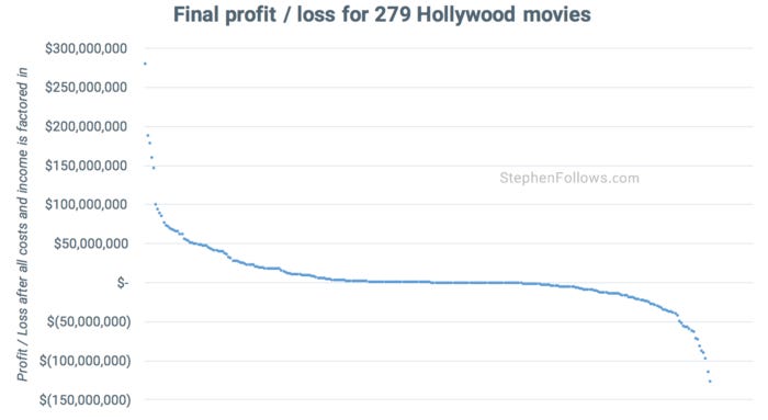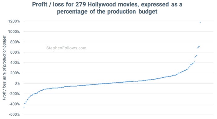 As we've seen, the movie business is led by extremes, where a handful of movies can either make or lose epic sums of money. This means that while overall the 50:50 rule seems to hold up, we can't say that each film has a "50% chance of making money". Success is the movie business may be opaque and tricky but it most certainly is not random.