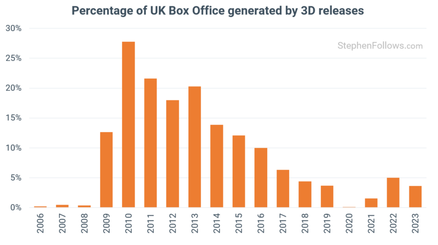 In 2010, over a quarter of all the money raised at the UK box office went to 3D releases. In 2023, the figure sat at just 3.6%