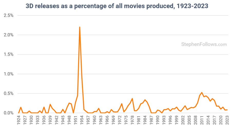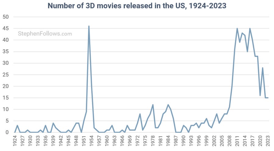 The high point for 3D releases in the US was 1953, but was soon followed by a crash.