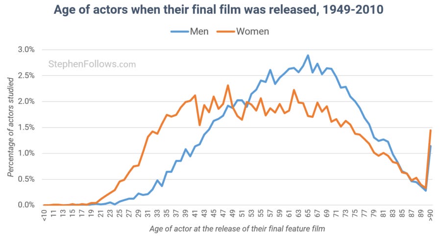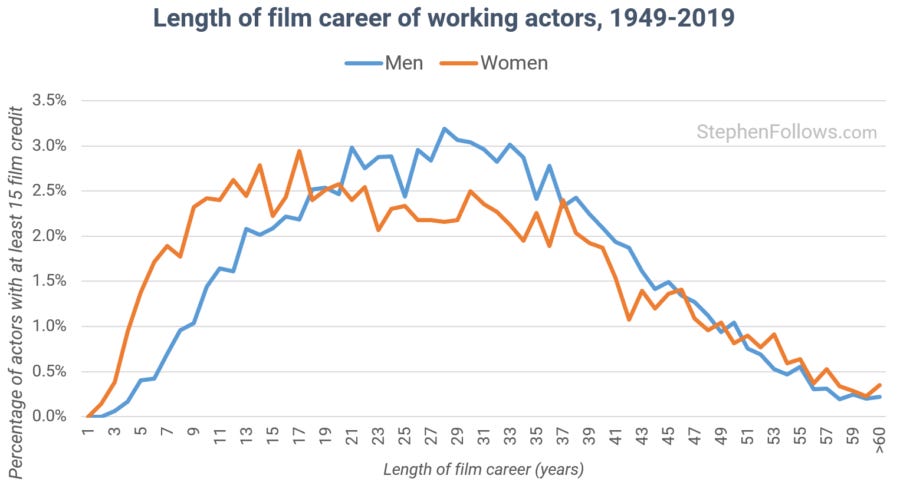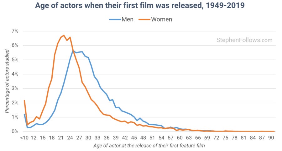 In previous research, I have shown that men and women have very different experiences of the acting profession. Whilst there's no doubt that all actors face pressure to appear youthful, women are under more close scrutiny and are punished for ageing far more than men. We see this reflected in the differences between how old actors are when they receive their first film credit.