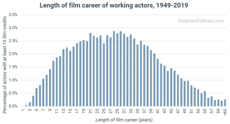 Another metric is the number of films they have been hired to appear in. And it's this we're looking at today, thanks to a reader who got in touch to ask about the length of acting careers.