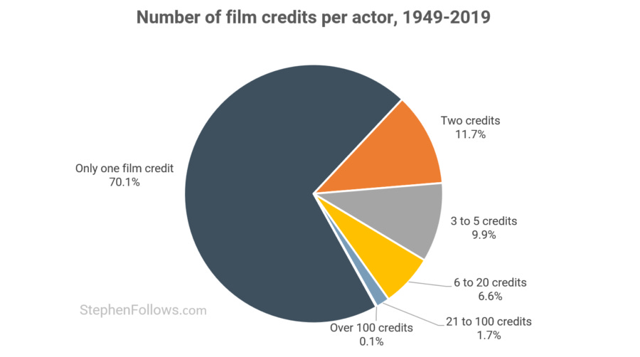 70.1% of people who received one acting credit on a movie never received a second. Only 8.4% received more than five credits and fewer than 1% received more than 30.