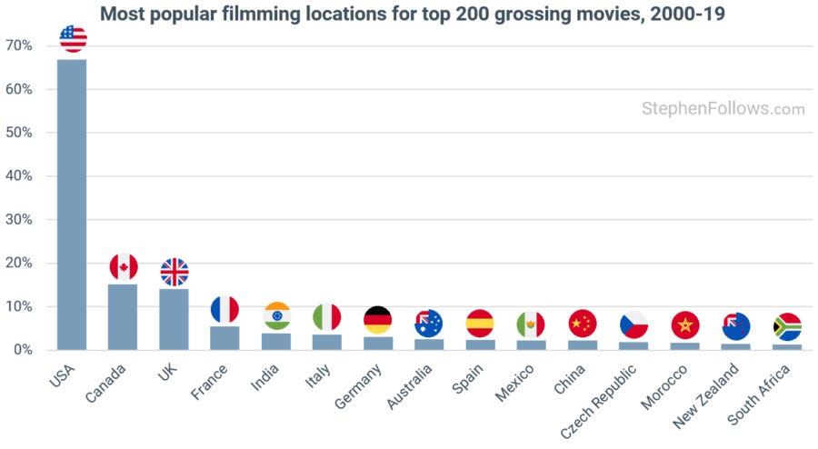 It will come as no surprise that the most popular shooting destination for top-grossing movies is America. That said, I suspect that many people may be surprised to hear that a third of such movies do not shoot in the US.