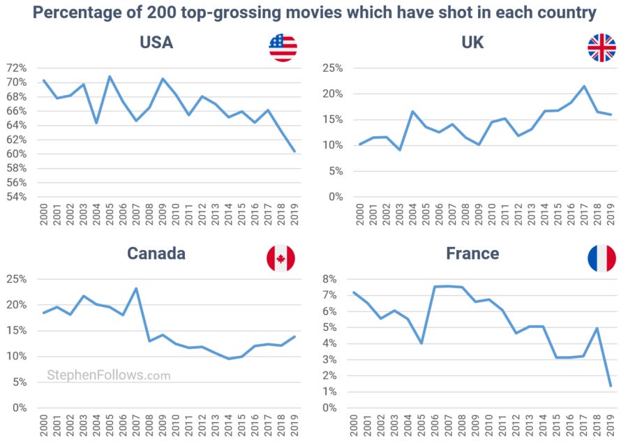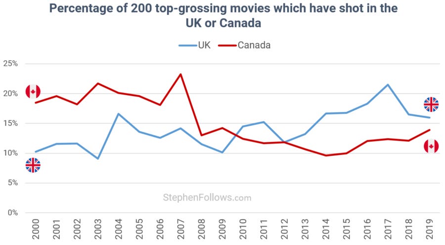 This came at the expense of Canada, which has traditionally been Hollywood's home from home. The chart below shows the shifting fortunes of the two countries.